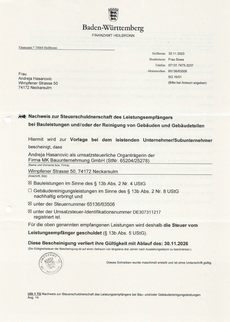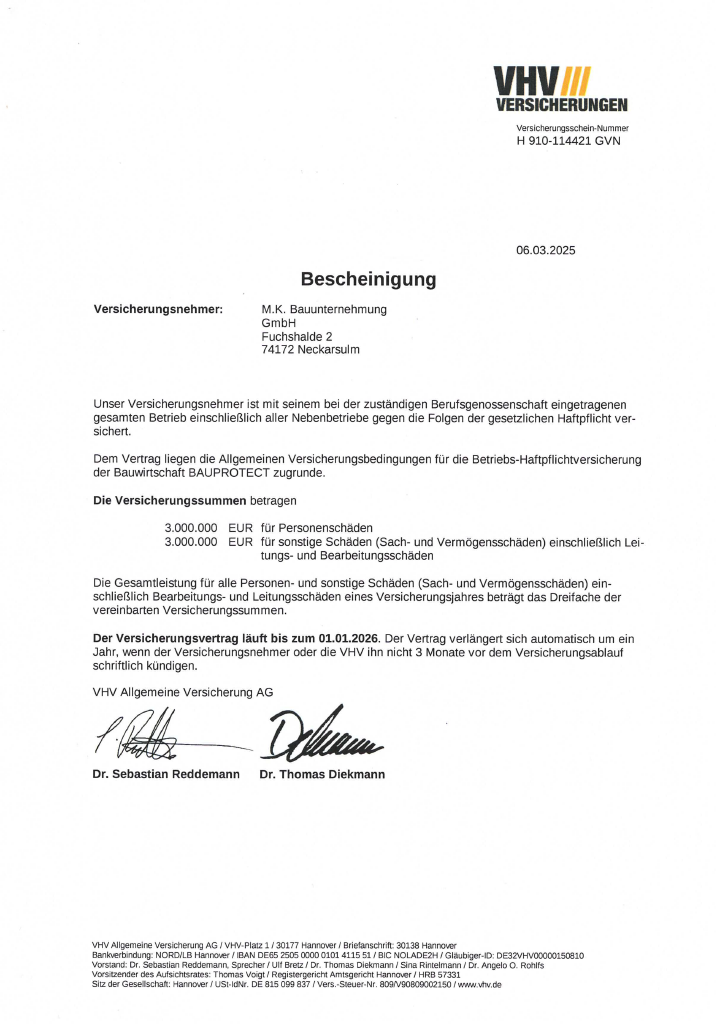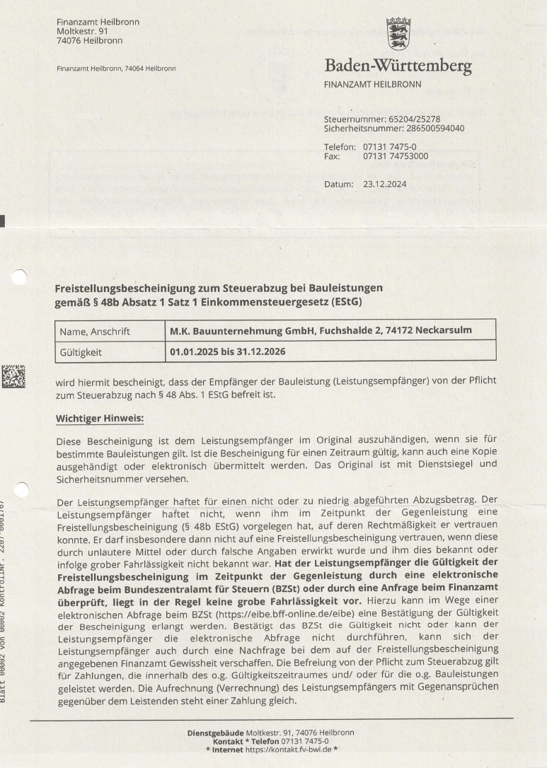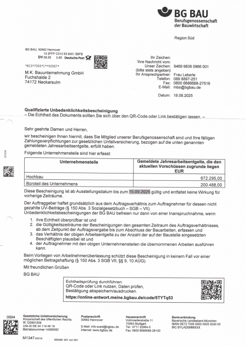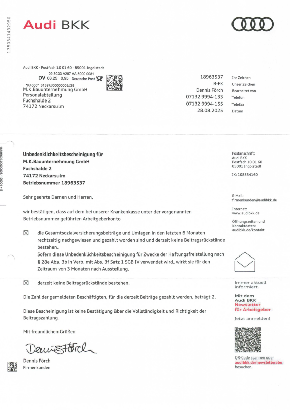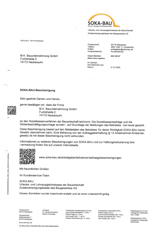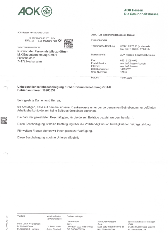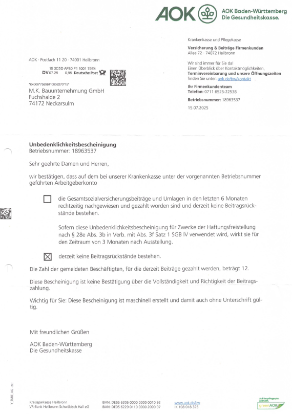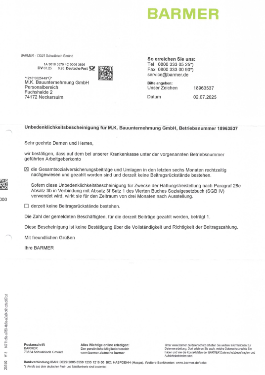 Unbedenklichkeitsbescheinigung Soka 07-25Herunterladen Unbedenklichkeitsbescheinigung BG Bau 08-25Herunterladen Unbedenklichkeitsbescheinigung AOK Hessen 07-25Herunterladen Unbedenklichkeitsbescheinigung AOK BaWü 07-25Herunterladen Unbedenklichkeitsbescheinigung ikk classic Herunterladen Unbedenklichkeitsbescheinigung Audi BKK 08-25Herunterladen Unbedenklichkeitsbescheinigung Barmer 07-25Herunterladen Freistellungsbescheinigungen Nachweis zur Steuerschuldnerschaft des LeistungsempfängersHerunterladen Freistellungsbescheinigungen FreistellungsbescheinigungHerunterladen Haftpflichtversicherung Haftpflichtversicherung 0325Herunterladen